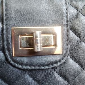 Very beautiful simple black handbag with gold chain and gold buckle does show signs of wear on outer corners and buckle as seen in pictures price reflects that