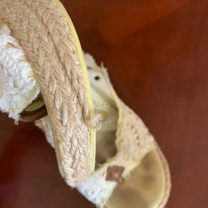 Cream lace with yellow accents. Show signs of wear. Tweed coming loose in spots- see pictures. Still tons of life left. Marked 38 but run atleast a half size smaller so listed as a 7.5