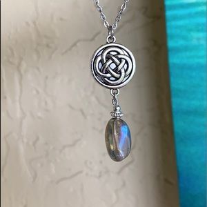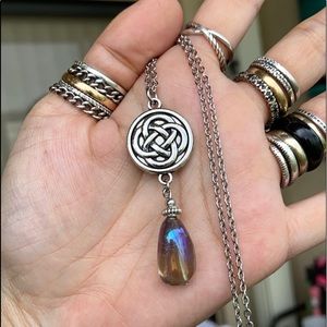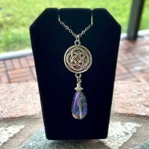 Celtic knot & genuine titanium aura crystal quartz necklace . Stainless steel chain is 16 inch ( If you need a different size lmk ! ) Handmade by me πCeltic knot coin charm is silver plated . gemstone / natural healing stones / gift / Irish / nordic / viking / boho / witch / Stylish, magical , mystical , dainty , gems , trendy ,chic , pendant , bohemian ,celtic , goth , enchanted .