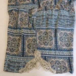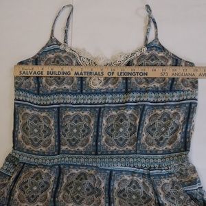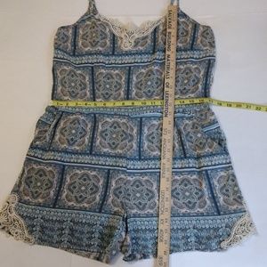 Pretty, flirty shorts romper. Sleeveless w/adjustable spaghetti straps. Shades of blue, white & brown in a pretty small paisley-like pattern. Cream colored lace accents the V-neck & the outside corners of the shorts.