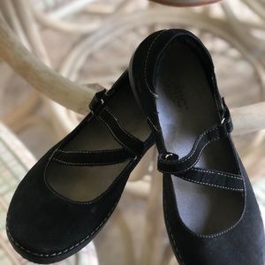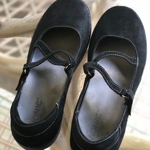 Black suede vionic Mary Jane style shoes with adjustable Velcro straps. Worn very few times, in very nice condition.