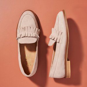 Size 10 blush Anthropologie Liendo by Seychelles Ruffled Loafers. A ruffled upper lends a feminine feel to this otherwise menswear-inspired silhouette. Note: Color is more like a muted tan-pink. On top flap of right shoe, the suede has slight wrinkles/indentations. On inner side back heel, there is a small manufacturing defect in leather piping. See photos. NIB.