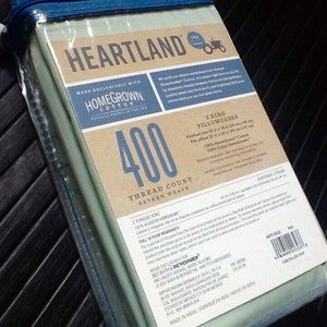 brand new Heartland 400 Thread Count Cotton Sateen King Pillowcases. The name of the color is Mint Green and it is solid / no pattern / unpatterned. The label on the package states: "Each King Pillowcase is 20 inches X 40 inches to fit pillows 20 inches X 36 inches. Machine washable." Condition is brand new, factory-folded in unopened, undamaged, original retail packaging.