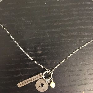 Silver clasp necklace. Charms read “Adventure on” and cardinal directions with pearl charm. Very fun for the recent graduate or traveler in your life!