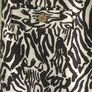 Lilly Pulitzer Layton dress in Full Entourage print, size medium. Very flattering, dark brown/nearly black zebra print, exposed gold zipper in back and logo buttons on front pockets. GUC with some fading as shown on size tag pic.