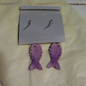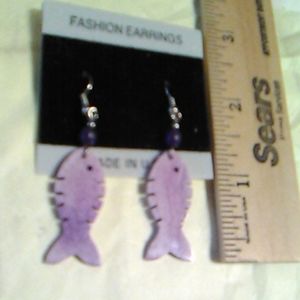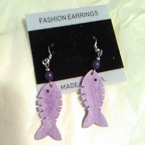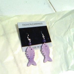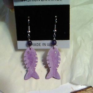 This charming lavender Fish pair of earrings is new and still on original card. The bead over the fish is dark purple and they are pierced and dangle earrings.