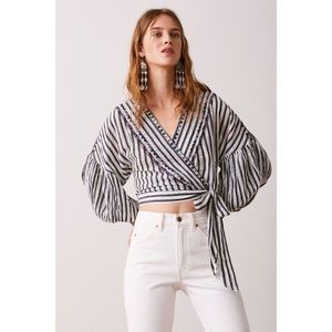 Lightweight gauzy cotton wrap top featuring a stripe design and embroidery detailing.