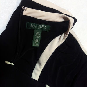 This ruched black sheath dress has flattering strips of cream fabric at the sides, front, collar, and arm holes for a slimming effect. Fully lined, machine washable!! Has partial zip at back of collar.