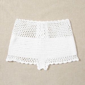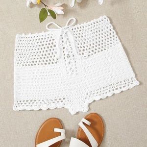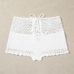 Super cute white crochet non stretch, sheer, 100% polyester lace up shorts.