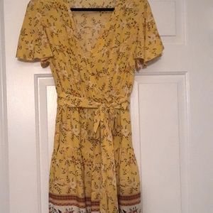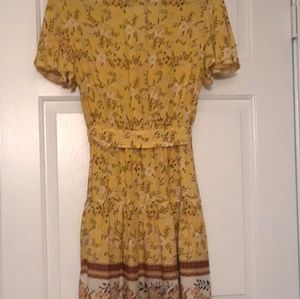 Gold and White Floral Print Boho Dress. Surplice top, elastic waistband. Well made cute dress, ties at the waist with or without the belt included. You can also use your own belt.