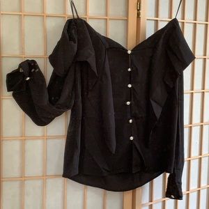 Black soft polyester. Lulu Mari Brand. Adjustable shoulders. Beautiful blouse with imitation shiny diamonds buttons. ❤️ like new.