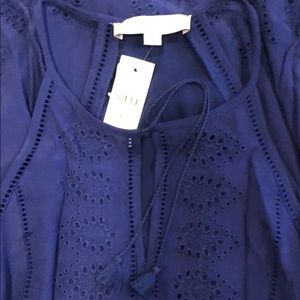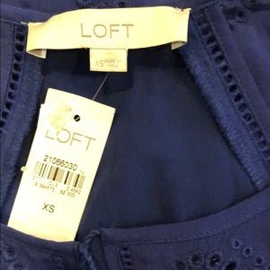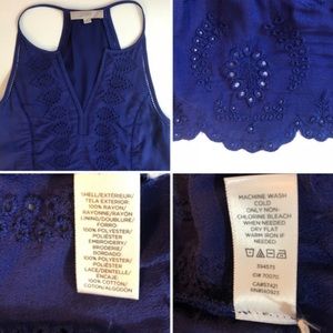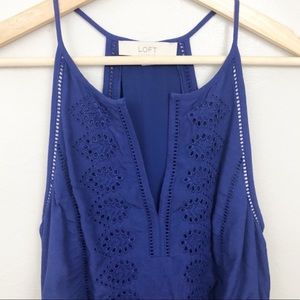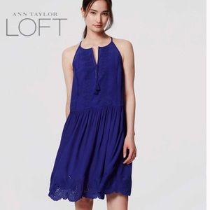 LOFT szXS deep blue eyelet lace sleeveless dress. New w tags . Beautiful deep blue sleeveless halter dress with lots of details - delicate eyelet embroidery, subtly scalloped edges, and punch-out lace trim. perfect for the warm weather & complete the look w ether pointy flats or sandals for an effortless feminine look. Unlined. Flat measurements Bust 17” Waist 16” Length 38”