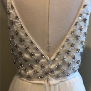 Bold beading on the bodice brings shimmer and texture, while a flowing tulle skirt provides plenty of movement. A plunging v-neck and back round out this romantic look.