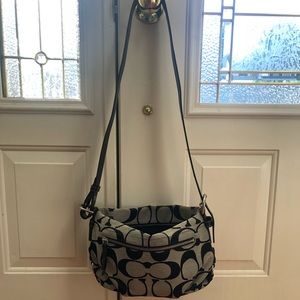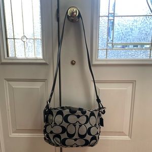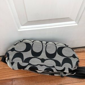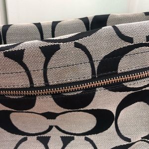 Excellent condition coach signature duffle adjustable strap two small marks (3rd pic) and has small discoloration above zipper (4th pic) no rips holes or tears. Black and grey signature jacquard fabric inside one zipper pocket and two smaller pocket no stains inside purse receipt included