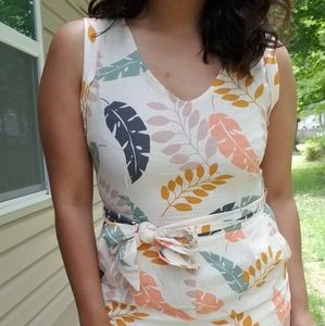 A classic jumpsuit with a colorful leaf print. Sleeveless with a folded accent. V neckline. Removable sash belt. Pockets. Lined. Cuffed pant leg. Button in the back with keyhole opening. Hidden back zipper.