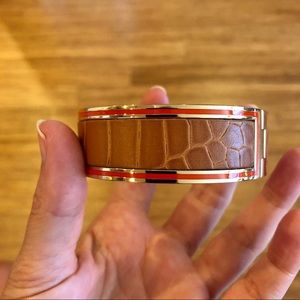 Henri Bendel cuff bracelet with cognac leather and orange detailing. Cuff opens and closes at front clasp. 2.7 inches in diameter.