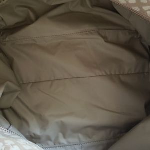 Like new diaper bag in great condition! This diaper bag is so spacious and only been used a few times.There is a large zipper pocket, 2 large pockets and 2 side pockets inside. There are no stains, no holes or spills on the bag. The only flaw is the leather lining that came off the leather strap which could be easily be fixed with some glue (see photo). The bag does not come with the changing pad. Comes with stroller strap.
