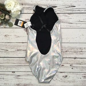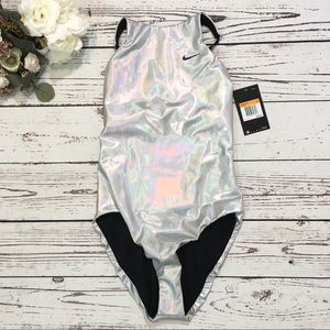 Nike flash silver high neck swimsuit NWT . Size small . Nike Swim Women’s Flash Highneck One Piece features a high bust, moderate style back and standard legs for extra coverage without impacting movement.