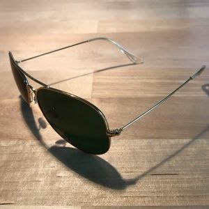 In Polished Gold/Gold Green Classic. Authentic RB 3025. Light wear - tiny scratches on frame, highlighted in yellow in the last picture. Purchase includes original Ray Ban case. Have been cleaned and sanitized.