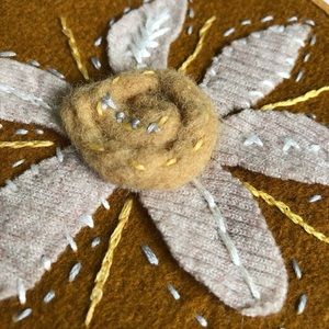Such a unique piece! The centre of the flower was shorn from my own sheep hand dyed with natural onion skins then hand carded and felted. All aspects of this piece of art are unique and handcrafted. Add some BoHo and authentic vibes to your accent wall or office space. Comment below if you have any questions.
