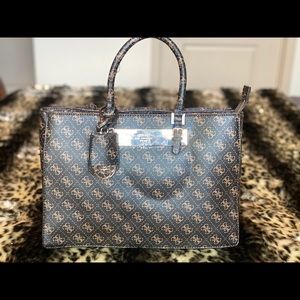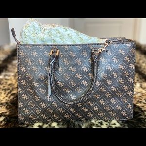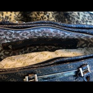 Brown with tan signature Guess lettering on the outside. Signature Guess style and animal print interior. Original tags attached.