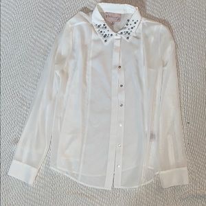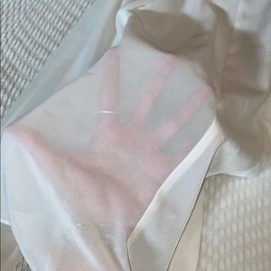 sheer long sleeve button down with beautiful pearl collar - so classy and chic !!! you can tell how see through it is in the 4th photo with my hand underneath. let me know if you have any questions