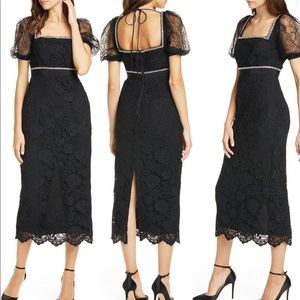 Twinkling beads trim the square neckline and grosgrain-wrapped waist on this romantic lace sheath left unlined at the sleeves for a delicate finish.