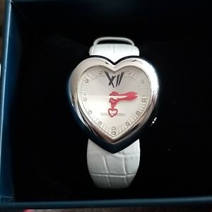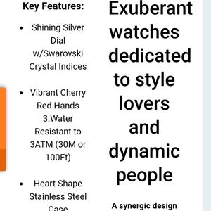This gorgeous watch is unique it has a face that is beveled to give it a different look no matter who you look at the face. Large vibrant cherry red hands on a white background with a genuine white leather textured strap. Shining stainless steel silver dial with Swarovski crystal indicies.