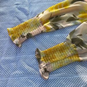 A breezy woven midi dress with a mock wrap silhouette is detailed with a tie waist and colorful floral print including smocked cuffs and shoulders.