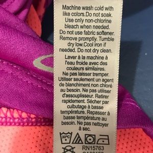 Purple and orange attached sports bra w/ elastic bottom and no padding and purple, breathable racer back with orange down sides and two thick stripes down back