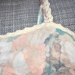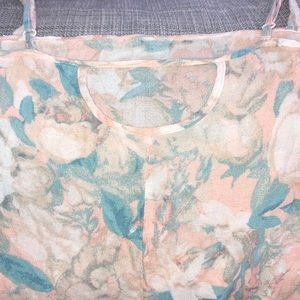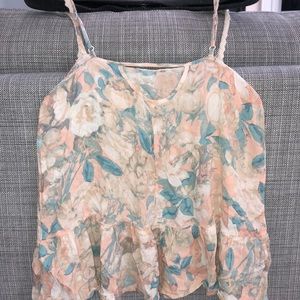This Forever 21 tank top has a floral print that is light blue and pink. It has ruffles on the bottom and woven detailing on the straps and top. It is super light weight making it perfect for summer days!