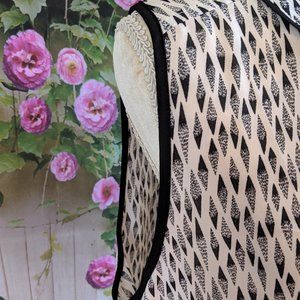 It has a subtle geometric design with piping at the neckline, , front, sleeves, sides and hem. It has a flattering split hemline and a pretty button at the neck.