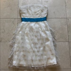 This strapless cream ruffled dress with turquoise bow detail is in perfect condition! An impressive feat after being worn once to a bar mitzvah with a chocolate fountain.