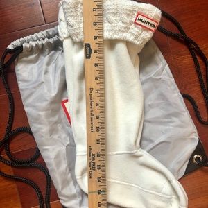 Size L Hunter boot socks, like new! Comes with a Hunter nylon bag. Nylon bag has a seam pulled out that could easily be sewn or used for storage of the socks. Pictures give approximate measurements