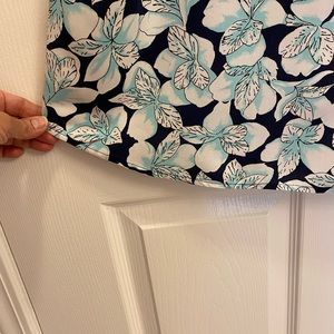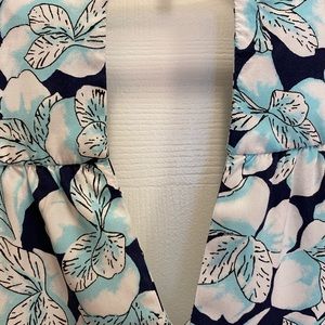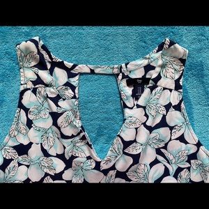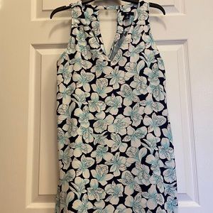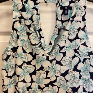 Gap Donating 9-1 size Medium sleeveless dress. Navy dress with White/Aqua flier print. V-Neckline. Keyhole back. Small Ruching on shoulder strap. Scooped hemline. Hits mid thigh. 100% Rayon. Approximate measurements are length 37”, pit to pit 20”. Perfect for warm weather and a cute pair of sandals or wedges.