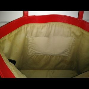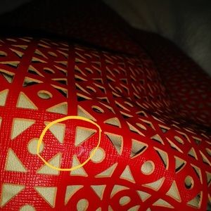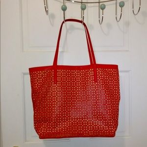 Cute Eyelet Style Tote Red Orange Shoulder Bag. Has some stains inside lining and some inks but barely noticeable. As circled in pictures there’s minor flaws. But barely noticeable when carrying the bag. Very cute perfect for Spring and Summer.