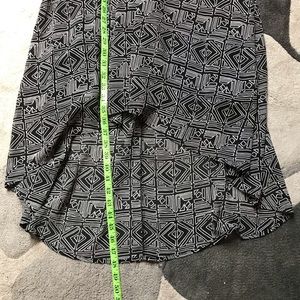 Black-and-white hi-lo dress with bright pink trim. Side lace detail at waist. Slip. Adjustable straps. Bust: 18”, Length (Long): 46”, Length (Short): 36”.