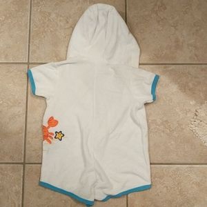 Toddler 24 months beach theme cover up is perfect to throw on after a swim! Terry fabric with appliques. Lined hood. Snapped bottom. Minor spots (pictured) can be easily treated.