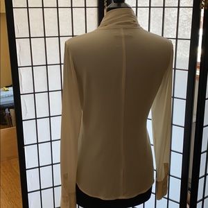 Classic and classically Rachel Zoe. Low cut neckline but with a sedate tie in front. Slightly sheer and tailored with princess seams. So, as I said, classic and sexy at the same time which is what Rachel Zoe is about. 94% Silk with 6% Spandex so it has a little stretch. Bust line 18” and length is 22”. Has a 4 button cuff for added awesome.
