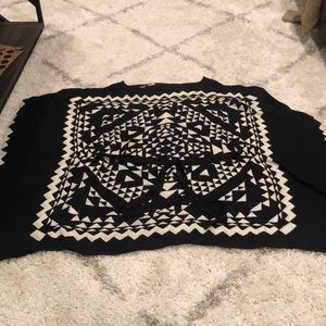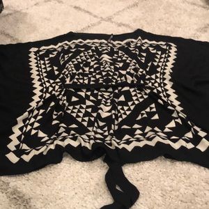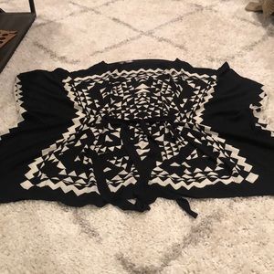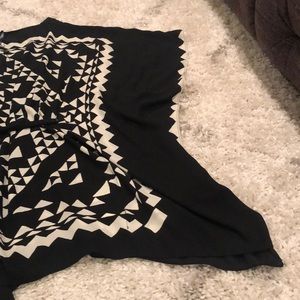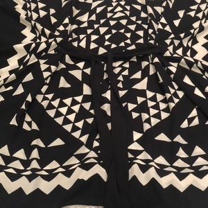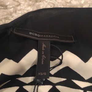 BCBG kaftan dress with black and off white triangular pattern on front and back. Tie belt with wide sleeves. Fabric is soft, light and semi sheer. Size XS/S. Worn once at a wedding. One end of the BCBG logo tag is not attached. Open cut allows for room-dress is not form fitting.