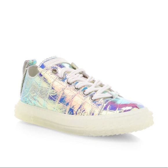 Authentic & new, GIUSEPPE ZANOTTI lowtop leather sneakers elevated with a shimmering iridescent finish. Lace-up vamp & Heel tab, Padded insole & Rubber sole. Orig box & Dust bag included. Made in Italy.