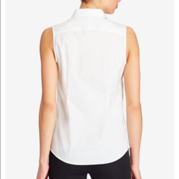 Easy-care button down sleeveless shirt from Kasper Separates. 100% cotton. Gnetly Used (worn 1-2 times). Machine Washable. Wrinkles fall out upon drying. Wash/Dry/Wear. This one has not been in the dryer--just dried on the rack.