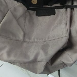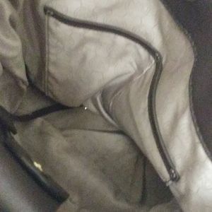 This bag is huge! It has handles as well as shoulder straps. The shoulder straps drop is 12 in. The purse is 12 inches height by 14 in length. It has four feet on the bottom. The inside contains four slip pockets two on each side and also contains 1 zippered pocket. The inside of the bag is cream the outside is dark brown. EUC Very clean on the inside no marks that I have found. A few scratches where the lock on the front has slid back and forth. This tote bag will carry everything you need!