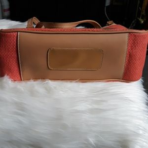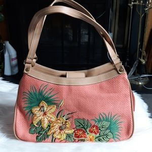 Faux straw with floral embroidery. Mauve with tan straps. 2 sides with Zipper in the middle and on one side (inside). See photos