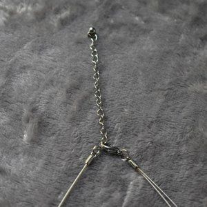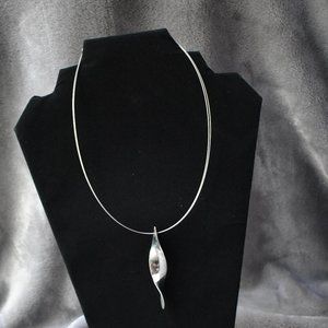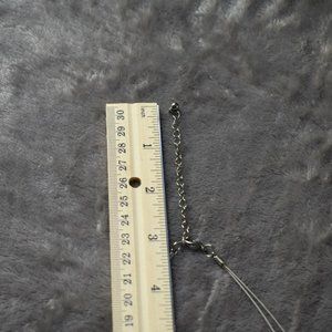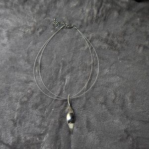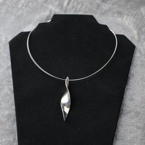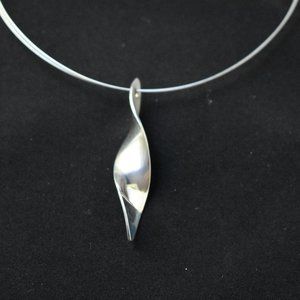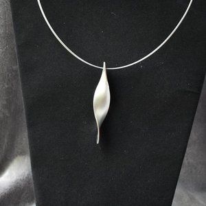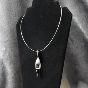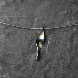 Gently used silver twist pendant with a double wire silver chain. The approximately 3 inch pendant is shiny, reflective silver on one side and a matte silver on the other side. The 15 inch double wire chain includes a adjustable 3 inch extender. Perfect for either a night at the club or with a suit in the office.