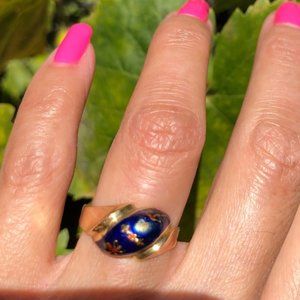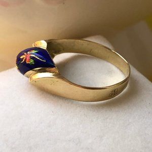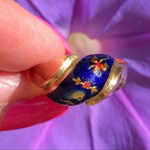 This is a gorgeous Vintage 18K Yellow Gold Ring with beautiful Royal Blue, lime green and orange Enamel detailed design. It is stamped 750 (18K) and VI outside the shank. It weights 3.70 Grams. In very good condition for its age.