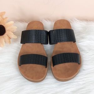 A basic and chic pair of sandals that can be worn every day! Open toe sandals. Flat Sole. Two bands across the top in a gorgeous crocodile faux leather material.