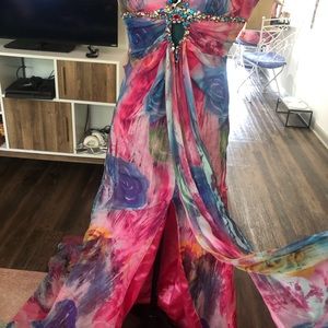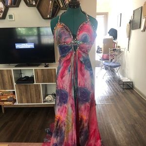 This dress is incredible! I love the colors and the pattern. Turns heads everywhere. Beading on neckline, mermaid cut, pink train, and slit in front. Size 0.