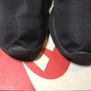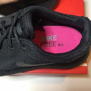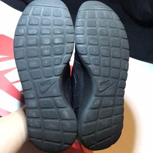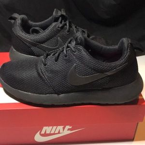 Women’s size 6. All black Nike Rosherun. These pink insoles can be replaced. This is not the original insole it came with. Great for workplace that requires solid color shoe. Shoe is in decent condition. You will see some of the glue around the sole of the shoe. It’s only certain parts but the shoe is still in tact. Will ship with box. Gently used but still has a good wear time. Please look at pictures before purchasing.