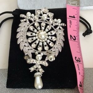 New Silver and Faux Pearl Brooch Pin. It measures 3 1/2 inches in length. It has Faux crystal stones and faux pearls.